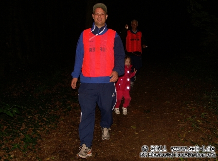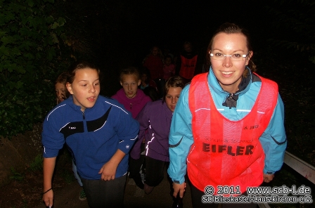 Nachdem die Zelte bezogen und die ersten rund tausend Bälle gen Tor gejagt wurden waren auch die letzten hartnäckigen Streitigkeiten um die besten Zeltplätze geklärt und nach einem kurzen Schauer machte sich gegen 22:00 Uhr Unruhe im Schlafquartier der SC-Jugend breit. Es wurde dunkel, die Flutlichter wurden eingeschaltet und es war klar was auf dem Programm stand: Die SC-Nachtwanderung warf ihre Taschenlampen-Schatten voraus und nachdem auch die letzten Eltern schweren Herzens für eine Nacht ByeBye zu ihren Sprösslingen gesagt hatten ging es für den SC-Nachwuchs, bestehend auf 20 jungen und 15 Mädchen auf den Weg durch das nächtliche Blieskastel, auf dem selbstredend die Taschenlampe nicht immer erlaubt war. Dass da auch einige Betreuer an die Grenzen ihrer Kräfte kamen, sei denen verziehen, die bislang keine Vorbereitung an den Klostertreppen mitgemacht hatten. So zog der SC-Tross durch die Wälder und Straßen der Borrockstadt und legte ein unglaubliches und rekordverdächtiges Tempo vor.