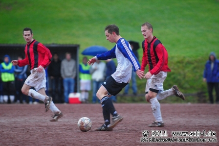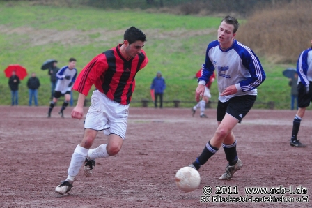 Die Partie in Walsheim begann für die von Beginn an hoffnungslos unterlegenen Gäste aus Blieskastel-Lautzkirchen nicht nur ob des Wetters schlecht, vielmehr musste Gästekeeper Felix Bastian nach 21 Minuten erstmals hinter sich greifen, als ein Angriff über rechts vom SC nicht geklärt werden kann und John Stumpf bei, schon jetzt lethargischen SClern, mit dem 1:0-Führungstor bedankt. Der SC kam nie wirklich in die Partie und so war es nach 26 Minuten Stefan Hohnsbein, der zum 2:0 traf. Zuvor konnte SC-Kepper Bastian einen Freistoß der Sportfreunde zwar abwehren, der SC verfiel aber bei der sich bietenden Nachschussmöglichkeit in Tiefschalf. Walsheim merkte, das man den Gästen heute richtig weh tun konnte und kam nach 40 Minuten sogar zum 3:0, als Hohnsbein eine Hassli-Flanke zum 3:0 einköpft. Die SC-Defensive sah beim dritten Gegentreffer erneut nicht gut aus. Die SC-Fans wurden geweckt, als Patrick Stumpf nach 44 Minuten mit einem Verzweiflungsschuss zum 3:1 traf, die Hoffnung bei den SClern währte aber nur Sekunden, konnte doch Hassli nach 45 Minuten die gesamte SC-Defensive inklusive Schlussmann düpieren und mit einem Drehschuss aus 20 Metern zum 4:1-Pausenstand treffen.