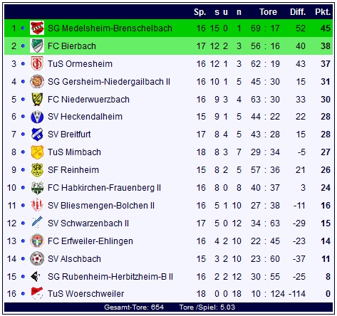 In der Tabelle der Kreisliga A Bliestal gibt es entsprechend kaum Veränderungen, einzig Bierbach schiebt sich mit nunmehr 38 Punkten auf Rang zwei bis auf vier Zähler an den Spitzenreiter der SG Medelsheim-Brenschelbach heran: