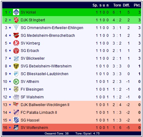 Auch die Tabelle der Bezirksliga Homburg wird mit ersten Punkten und Toren gefüllt. Die Aussagekraft der Tabelle hält sich aber wie immer zum Saisonstart in Grenzen, aber wer weiß, vielleicht setzen sich die Teams auf Dauer genau dort fest wo sie jetzt stehen, ob sie es wollen oder nicht: Kirkel steht jedenfalls zum Saisonstart ganz oben, folgerichtig steht Wolfersheim ganz unten in der Auftakttabelle: