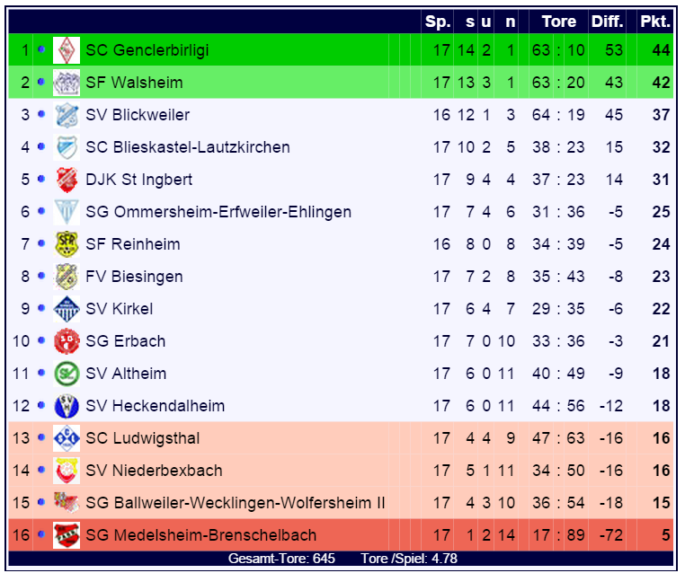 Komplettiert wurde der 17te Spieltag durch ein heißes Bickenalb-Derby: Die SG Medelsheim-Brenschelbach überwinterte mit zwei Punkte auf dem letzten Tabellenplatz und wollte nun gegen den mit 18 Punkten elften der Tabelle gleich zu Beginn des Jahres Punkte sammeln. Nun gilt es für die SG für den sicheren Klassenverbleib die 16 Punkte Rückstand zum sicher rettenden Rang 12 aufzuholen, wo eben der SV Altheim mit 18 Punkten steht. Dabei helfen sollen die Neuzugänge. Mit dem früheren Spieler Kevin Schmitz, der zuletzt bei den Sportfreunden Walsheim spielte, der die Offensive merklich verbessern soll, sowie Dominik Schneider von der SG Gersheim-Niedergailbach haben sich die Medelsheimer verstärkt. Zudem wird auch wieder Michael Brüggenkamp die Fußballstiefel schnüren, für eine Stabilisierung der Defensive sorgen. Vierte Verstärkung ist Nachwuchstalent Florian Schwarz, der aus der eigenen Jugend zu den Aktiven gekommen ist. „Seit Anfang Januar fließt der Schweiß bei wöchentlich drei Trainingseinheiten“, erklärt der neue alte Trainer Jochen Strobel in der Saarbrücker Zeitung. Strobel hatte im vergangenen Herbst seinen eigenen Nachfolger als Trainer abgelöst, als Christian Schmelzer bei der SG entlassen wurde und er wieder das Ruder übernommen hatte.