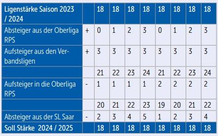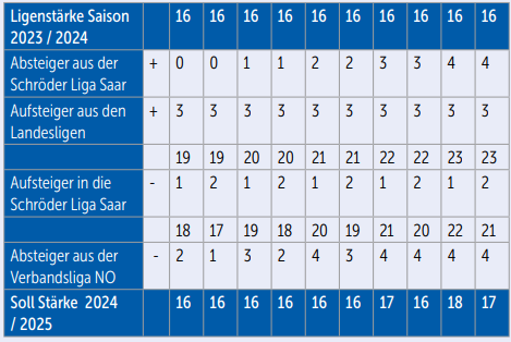 Die Saarlandliga geht als höchste saarländische Spielklasse mit 18 Mannschaften in die Saison 2023/2024. Beim Blick auf die Zahlenschlüssel werden die unterschiedlichen Konstellationen im Auf- und Abstiegskampf klar: