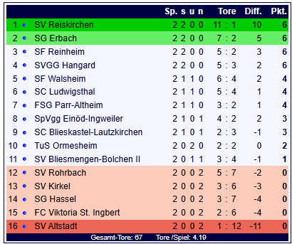 Vor 150 Zuschauern auf dem Sportplatz der Sportfeunde aus Reinheim setzte sich der Aufsteiger der SF Reinheim mit 3:1 gegen den SV Kirkel durch und bleibt damit auch nach dem zweiten Spieltag ungeschlagen. Die Gäste aus Kirkel gingen in der 19. Minute durch Kim Boutter in Führung – sein erstes Saisontor. Reinheim brauchte bis kurz vor der Pause, um zu antworten: Ihsan Erdogan traf in der 45. Minute zum Ausgleich – ebenfalls sein erstes Saisontor. In der zweiten Halbzeit war Erdogan erneut zur Stelle. In der 77. Minute brachte er Reinheim mit seinem zweiten Treffer in Führung. Den Schlusspunkt setzte er in der 90. Minute mit seinem dritten Saisontor, bevor er direkt im Anschluss ausgewechselt wurde. Mit diesem Sieg steht Reinheim mit sechs Punkten und einem Torverhältnis von 5:2 auf Tabellenplatz 3. Kirkel bleibt nach zwei Niederlagen punktlos und steht mit einem Torverhältnis von 3:6 auf Rang 13.