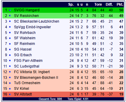 Auch nach dem Seitenwechsel blieb der FC Viktoria St. Ingbert dominant. In der 59. Minute wurde zunächst ein klares Abseitstor notiert, doch nur wenig später fiel dennoch das 5:0: Leon Backes traf nach Vorlage von Maximilian Diehl und erzielte damit seinen dritten Saisontreffer, während Diehl seine siebte Saisonvorlage sammelte. Mehr Tore fielen anschließend nicht mehr, sodass die Gäste einen auch in dieser Höhe verdienten Erfolg mitnahmen. Die SVGG Hangard bleibt trotz der klaren Niederlage mit 50 Punkten Tabellenführer und weist ein Torverhältnis von 84:44 auf. Die Viktoria aus St. Ingbert steht mit 28 Punkten auf Rang 13 und kommt auf ein Torverhältnis von 55:65.
