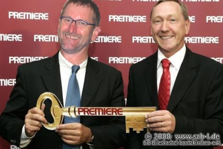 Unmittelbar nach der Vertragsunterzeichnung: 1. Vorsitzender des SC Günter Pusse (li.) und Premiere Geschäftsführer Michael Börnicke (li.)