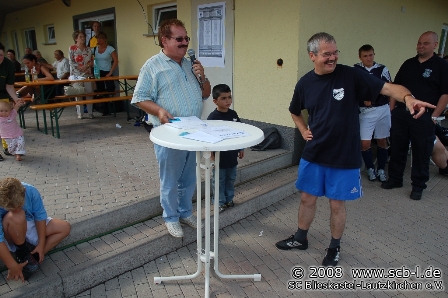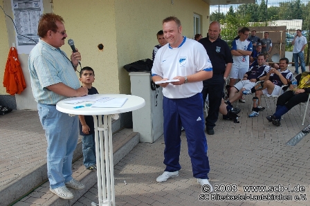 Die Jugendabteilung des SC Blieskastel-Lautzkirchen gehört zu den größten im Saar-Pfalz Kreis und dementsprechend viel harte Arbeit steckt auch hinter dem reibungslosen Ablauf für die mittlerweile fast 170 Jugendspieler im SC-Dress. Geehrt wurden seitens des SFV diejenigen, die hinter der erfolgreichen Jugendarbeit in Blieskastel stecken und dafür viel Freizeit opfern. Was oft als selbstverständlich erscheint wurde am Samstag in der Spielpause des „Eine Stadt spielt Fußball“-Turniers vom Saarländischen Fußball Verband ausgezeichnet. Neun Jugendtrainern des SC Blieskastel-Lautzkirchen wurde diese besondere Ehre zu teil unter dem Applaus von den zahllosen anwesenden Zuschauern empfingen sie ihre Ehrennadeln: Für besondere Verdienste in der Jugendarbeit wurden sechs SC-Trainer mit der bronzenen Jugendleiter-Ehrennadel des SFV ausgezeichnet: Markus Grötsch, Torsten Schmitt, Daniel Bartmann, Michael Zeigler, Walter Reinhardt und Marc Schaber wurden von Kreisjugendleiter Heinz Weber ausgezeichnet. Ferdi Kiefer, Rainer Blatt und Brukhardt Speer erhielten die silberne Jugendleiter-Ehrennadel.