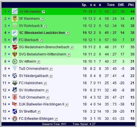 Ein Blick auf die gesammelten Ergebnisse lohnt also gerade nach diesem Spieltag, Spitzenspiel inklusive: Die Liga geht in die entscheidende Phase und für Spannung ist gesorgt: Den Zweiten aus Reinheim und den Siebten aus Bebelsheim trennen gerade 6 Punkte und auch die Teams auf den Relegationsplätzen wittern ihre Chancen, denn die Teams dafür nehmen sich Spieltag für Spieltag gegenseitig die Punkte weg...