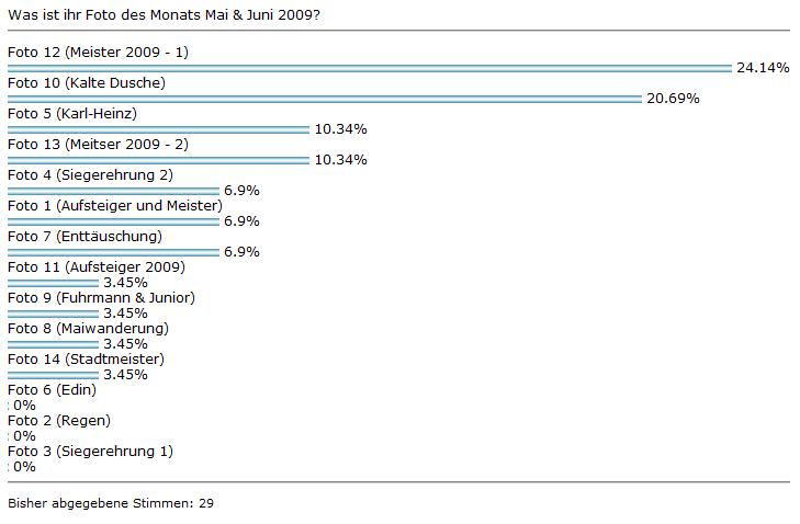 Wieder ist ein Monat zu Ende und damit ist auch wieder ein neues Foto des Monats auf SCB-Online gewählt: Ganze 14 Fotos standen in den Monaten Mai und Juni 2009 zur Wahl und den Usern fiel die Wahl offensichtlich nicht leicht: Hauchdünn mit nur einer Stimme Vorsprung bei rund 25% der Stimmen konnten die Meister der Zweiten Mannschaft auch ihren „Foto des Monats“-Titel verteidigen und sich denkbar knapp vor die kalte Dusche für Ex-SC-Coach HP Harz mit 21% setzen. Auf dem dritten Platz landete Karl-Heinz Fuhrmann bei der Maiwanderung des SC, zusammen mit dem Meisterfoto der E-Jugend des SC Blieskastel-Lautzkirchen. Beide kamen auf rund 10% der abgegebenen Stimmen. Eine Wahl mit einer knappen Entscheidung geht damit also zu Ende und hier gibt es das Siegerfoto und das Endergebnis der Abstimmung zur Wahl des Fotos des Monats Mai & Juni 2009: