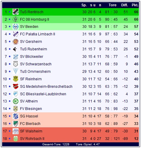 In der Tabelle bleibt im Abstiegskampf alles eng und spannend. Bis zum Saisonende werden wohl viele Teams um den Klassenverbleib zittern müssen. An der Tabellenspitze sackte Rentrisch einen wichtigen Punkt gegen Hassel ein und profitierte vom Homburger Ausrutscher in Ommersheim.