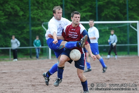 Nach der Pause verstärkte der TuS seine Offensivbemühungen, wollte man sich doch mit einem Sieg eine gute Ausgangssituation vor dem schweren Auswärtsspiel auf neutralem Platz beim abstiegsbedrohten SV Altheim verschaffen. Blieskastel blieb aber kampfstark und machte dem TuS das Leben schwer. Blieskastel spendierte dieser Partie genau die Zutaten, die in den Abstiegskampf gehören, kassierte dafür aber auch die eine oder andere gelbe Karte, was sich in der Folge rächen sollte: Der gelb-vorbelastete SC-Libero Markus Grötsch musste in einem Zweikampf zum Foul greifen und wurde folgerichtig des Feldes verwiesen. Nun galt es für den SC mehr als 20 Minuten in Unterzahl zu bestehen und das zu allem Überfluss beim Spitzenreiter aus Rentrisch. Aber Blieskastel ließ sich von diesem Rückschlag nicht aus dem Konzept bringen und verteidigte die Null in der Defensive mit vereinten Kräften, ehe Kristian Kropp für Jubelstürme bei den TuS-Fans sorgte, als er seine Elf mit 1:0 in Front schoss. Nun war die Situation des SC nicht unbedingt die beste: Mit einem MannUnterzahl war man beim Spitzenreiter mit 1:0 in Rückstand und benötigte im Abstiegskampf eigentlich einen Punkt aus dieser Partie. Die Lage war also fast aussichtlos, aber es zeichnete den SC in dieser Partie aus, dass man nicht etwa in seine Einzelteile zerfiel, sondern weiter versuchte das Aufbausspiel des TuS früh zu stören und die treffsichere Offensivreihe des Spitzenreiters vom eigenen Tor fernzuhalten. Dann aber begann der SC, der nun Patrick Stumpf für Sven Sandmeyer brachte plötzlich selbst offensiv aktiver zu werden und siehe da, eine der wenigen Offensivaktionen wurde belohnt: Flavio Baier setzt sich gleich gegen drei TuS Akteure durch und kann im Strafraum nur durch ein Foul gestoppt werden. Ein Foulelfmeter war die logische Konsequenz und den verwandelte der eingewechselte Patrick Stumpf souverän zum 1:1-Ausgleich. Die Karten waren also trotz Unterzahl für den SC wieder neu gemischt und den Fußballfans stand eine spannende Schlussphase bevor. Der SC hatte durch einen Stumpf Weitschuss und einige schnelle Gegenstöße seine Möglichkeiten, während der TuS weiter die letzte Konsequenz im Offensivspiel vermissen ließ. Die Zeit lief für den SC und die Schlussminuten wurde nochmals hitzig: Aufgrund eines Trikotgrabschers wurde wenige Minuten vor dem Ende auch SC-Akteur Christian Müller des Felder verwiesen und so ging es mit doppelter Unterzahl in die Schlussphase. Blieskastel verteidigte den möglicherweise wichtigen Punkt allerdings mit voller Einsatz aller mittlerweile nur noch neun SCler und brachte das 1:1-Remis somit über die Zeit. Ohne Frage hatte Rentrisch ein spielerisches Übergewicht, aufgrund der kämpferischen Leistung hat sich der SC diesen möglicherweise wichtigen Punkt allerdings verdient und hält damit die Spannung im Titelrennen, wenngleich auch leider im Abstiegskampf.