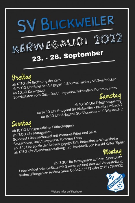 Ein Kerwespiel gibt es am kommenden Sonntag, den 25. September 2022 beim der SG Blickweiler-Breitfurt auf der Sportanlage des SV Blickweiler zu sehen: Am Sonntag, den 25. September 2022 empfängt die heimische SG um 15:00 Uhr die SVG Bebelsheim-Wittersheim.