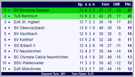 In der Kreisliga A Bliestal stand an diesem 14. Spieltag ein Spitzenspiel auf dem Programm. Der SV 09 Borussia Spiesen empfing den TuS Rentrisch. Am Ende ging der TuS Rentrisch als Sieger vom Platz und festigte den zweiten Tabellenplatz hinter der Borussia. Alle Tore und alle Spiele bei SCB-Online.