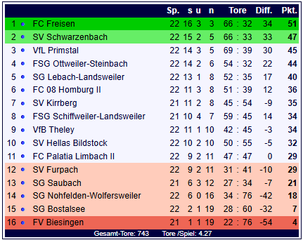 In der Tabelle festigt der FC 08 Homburg II mit nun 36 Punkten den 6. Platz bei einem Torverhältnis von 51:39. Der FV Biesingen bleibt mit 4 Punkten auf dem 16. Tabellenplatz und weist ein Torverhältnis von 22:76 auf.