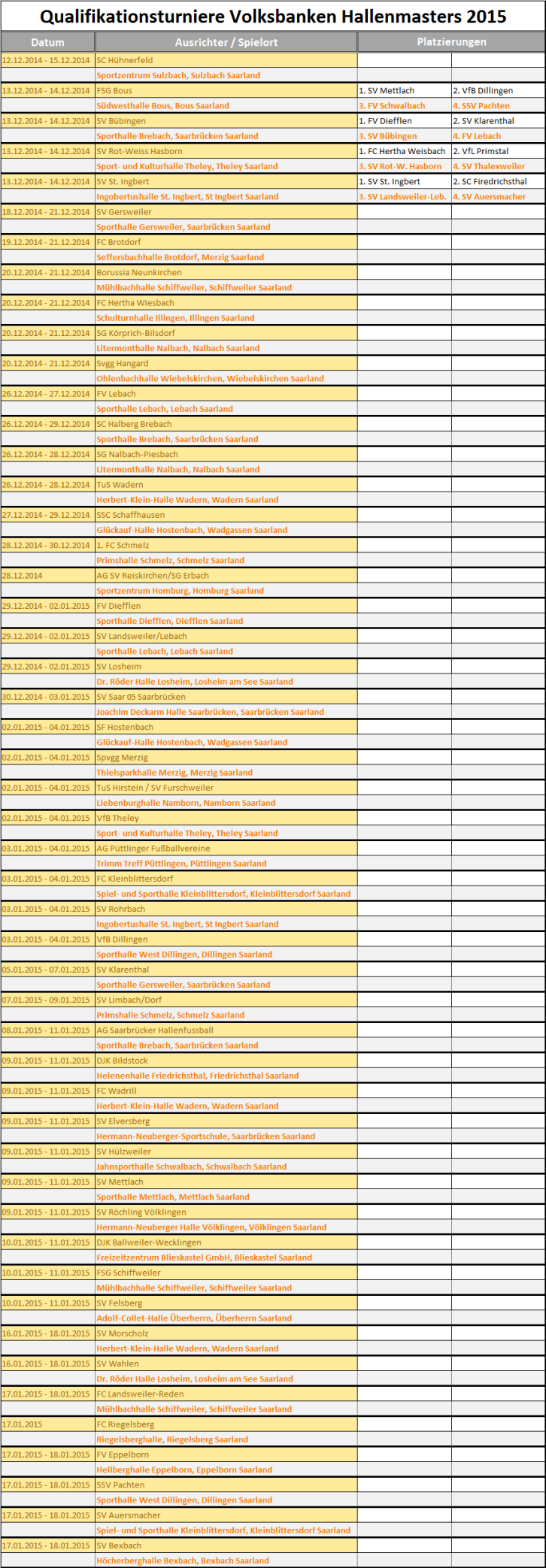 Damit ergibt sich auch die erste Qaulifikationstabelle, allerdings haben viele der Favoriten noch nicht in das Geschehen eingegriffen und das Turnier in Hühnerfeld wird erst heute entschieden. Dort stehen folgende Teams in der Zwischenrunde: Gruppe 1: DJK Bildstock, FSG Schiffweiler, SV Schnappach, SV Auersmacher; Gruppe 2: SpVgg Quierschied, SF Köllerbach, SV Bübingen, SV Saar 05 Jugend.