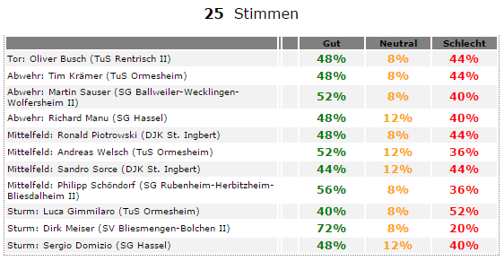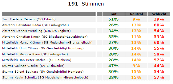 20. Spieltag: Gökhan Cicekci (SV Blickweiler, 77%), Sergio Domizio (SG Hassel, 60%)