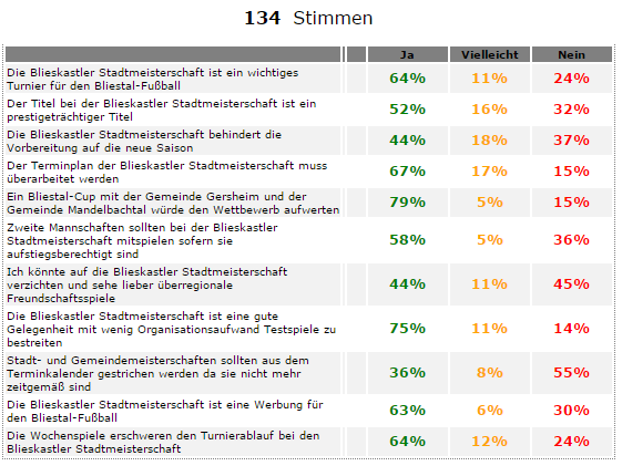 Die Blieskastler Stadtmeisterschaft 2015 sorgte im Bliestal nicht nur sportlich für Gesprächsstoff. Die Absagen am Donnerstag sorgten für eine ausgiebige Diskussion über die Zukunft des Wettbewerbs und auch SCB-Online wollte die Meinung der User erfahren. In einer ausführlichen Umfrage gaben 134 User ihre Meinung zum Turnier und dessen möglicher Zukunft ab mit dem klaren Ergebnis: 55% der User waren der Meinung der Wettbewerb ist noch immer zeitgemäß, stolze 79% der User würden es aber bevorzugen wenn die Gemeinde Gersheim und Mandelbachtal zukünftig zu einem Bliestal-Cup hinzustoßen würden. Ebenfalls denken 67% der User, dass der Terminplan des Turniers eine Überarbeitung nötig hat, beeindruckende 64% stützen aber noch immer die Aussage "Die Blieskastler Stadtmeisterschaft ist ein wichtiges Turnier für den Bliestal-Fußball".