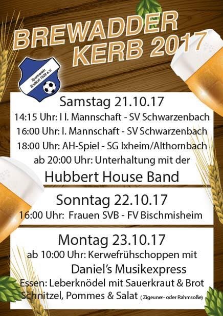 An der Brewadder Kerb gibt es einiges zu sehen: Bereits am Samstag, den 21. Oktober 2017 empfängt die SG den SV Schwarzenbach. Ab 14:15 Uhr spielen die Reserven in der Kreisliga Höcherberg, ab 16:00 Uhr stehen sich die beiden Ersten Mannschaften in der Landesliga Ost gegenüber. Ab 18:00 Uhr spielt die AH gegen die SG Ixheim-Althornbach, ehe es in den gemütlichen Teil des Abends übergeht. Am Sonntag, den 22. Oktober 2017 empfangen die Frauen des SV Breitfurt ab 16:00 Uhr den FV Bischmisheim, ehe am Montag, den 23. Oktober 2017 der Kerwefrühschoppen auf dem Programm steht.