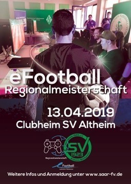 Beim SV Altheim rollt am Samstag, den 13. April 2019 der Ball nicht nur auf dem grünen rasen sondern auch virtuelle, denn eine der 32 eFootball-Regionalmeisterschaften des Saarländische Fußballverbandes (SFV) findet am 13. April 2019 im Clubheim des SV Altheim statt! Meldet euch jetzt an und daddelt euch mit eurem Teampartner zum Sieg, um das Ticket für die eFootball-Saarlandmeisterschaft zu lösen! Auch andere Vereine haben noch die Möglichkeit eine Regionalmeisterschaft auszurichten: Ihr wollt mit eurem Verein auch eine Regionalmeisterschaft in eurem Clubheim ausrichten? Über den folgenden Link könnt ihr euch anmelden: Anmeldung für Teams und Vereine